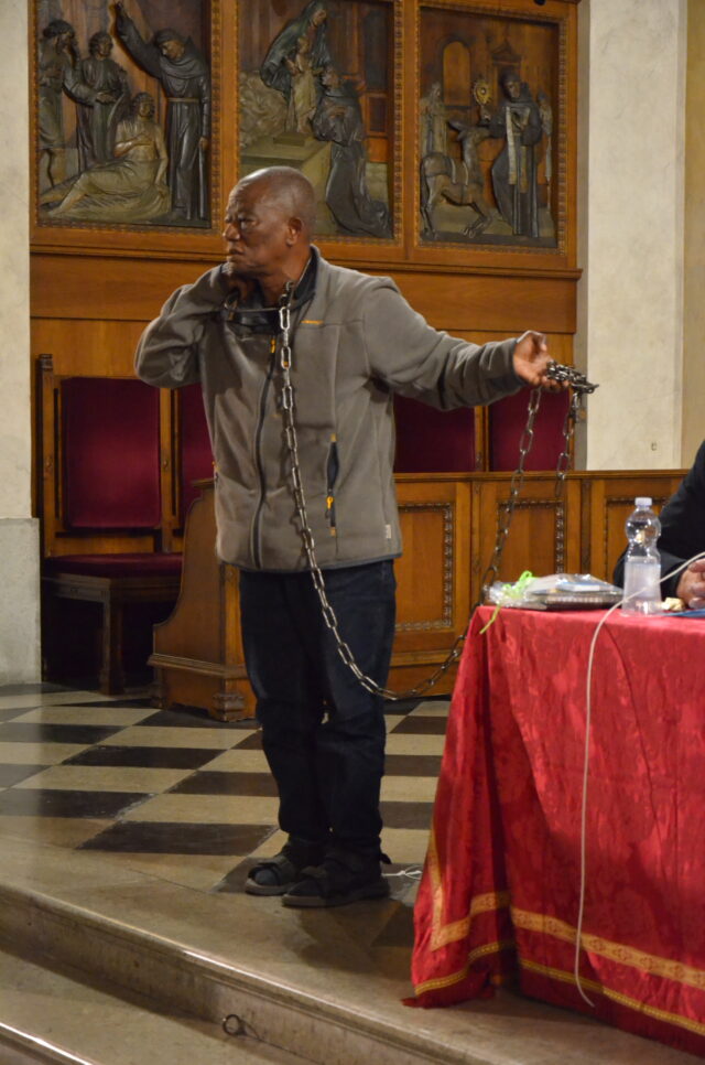 Una grande storia è stata vissuta a Trieste, per non abbandonare i malati psichiatrici. L’amore è il centro del miracolo che possiamo vivere oggi. Grazie a quanti partecipano al nostro servizio, per debellare la miseria vissuta dai malati di mente in Africa. Il vero grazie è il Signore stesso che ve lo darà: vieni benedetto del padre mio, per le azioni di prossimità che hai manifestato, nello spirito delle beatitudini evangeliche. Ho trovato un paziente psichiatrico incatenato ad un albero: l’immagine di ciascuno di noi, una vergogna per l’umanità. Da lì è iniziata la mia storia al loro fianco. Persona piena di piaghe. Tutto il suo corpo era marcio. Potrò ancora vivere? Ma è morto come un uomo. Ci sono state delle procedure di incatenamento incredibili in Africa. Le famiglie di questi malati non sanno cosa fare. A volte vengono istituiti dei campi di preghiera per chi viene emarginato a causa di un disagio mentale, usano il nome di Gesù per maltrattare gli ammalati psichici. Fanno soffrire il corpo perché esca il demonio. In strada, con la nostra equipe, raccolgo queste persone diversamente abili, cercando di curarle. Con un gruppo di volontari, insegno la capacità di svolgere un mestiere. Sono gli ammalati che curano altri ammalati. Noi viviamo grazie alla provvidenza. Pregate per noi, abbiamo bisogno del vostro aiuto».