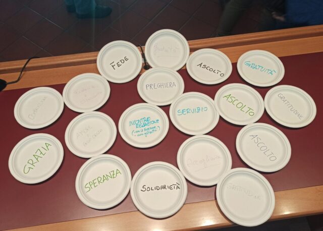 Dopo una mattinata di lavoro insieme alcuni semplici piatti di carta si sono riempiti di parole importanti – frutto della condivisione in gruppi – ed ecco comporsi sul tavolo un menu di tutto rispetto: non “pensato” con la testa, ma “vissuto” con il cuore. E così, “incontro, relazione con il Signore e gli altri”, nella sintesi di padre La Manna, diventa l’antipasto «responsabile di far capire che ci si trova ad una tavola di un certo livello»; in abbinamento ecco “preghiera”, «perché l’incontro con Dio non è un contratto che finisce il giorno in cui si firma, ma una relazione cui dedicare del tempo»; e ancora “servizio”, che è «quel gesto concreto che nasce dalla relazione con il Signore, che apre agli altri e che consente concretamente di riconoscerlo nelle persone più fragili». Questo tris di punta viene servito insieme a tutti gli altri piatti del menu: “ascolto”, “accoglienza”, “solidarietà”, “gratitudine”, “gratuità”, “fiducia”, “speranza”, “amore e Gesù Cristo”, “comprensione”.