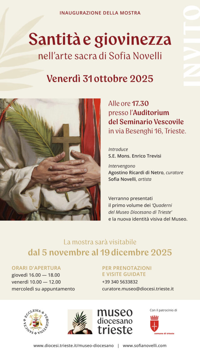 Sarà presentata venerdì 31 ottobre alle ore 17.30, nell’Auditorium del Seminario Vescovile di Via Besenghi 16, la mostra Santità e giovinezza nell’arte sacra di Sofia Novelli, esposizione monografica della giovane artista toscana, già affermatasi a livello nazionale nel campo dell’arte sacra cristiana. L’evento, che sarà introdotto dal Vescovo di Trieste mons. Enrico Trevisi, vedrà la partecipazione dell’artista stessa, in dialogo con Agostino Ricardi di Netro, curatore del Museo Diocesano.