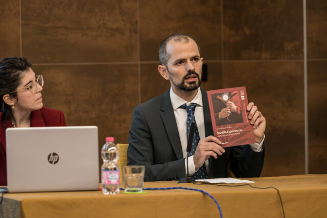 Il curatore Agostino Ricardi di Netro ha quindi esposto gli ultimi passaggi del cammino fatto in questi mesi, nei quali si è dotato il museo di una nuova identità visiva e particolarmente di un nuovo logo, a cura della triestina Silvia Borri, che riflettono lo spirito e l’ideale della neonata istituzione. È stato inoltre presentato il primo volume della collana dei Quaderni del Museo Diocesano di Trieste, pubblicato presso Luglio Editore, che intende dare inizio alle pubblicazioni periodiche sull’attività culturale ed espositiva svolta dal museo stesso. È quindi iniziato il vero e proprio dialogo con la protagonista della mostra, la pittrice Sofia Novelli, giunta da Prato per l’occasione, che ha potuto raccontare al pubblico alcuni interessanti aspetti della propria attività, passando da quelli pratici e materiali tipici di un lavoro fondato sull’artigianato, alle sfide dell’attività professionale, toccando poi i temi più delicati e personali della natura vocazionale del proprio lavoro.