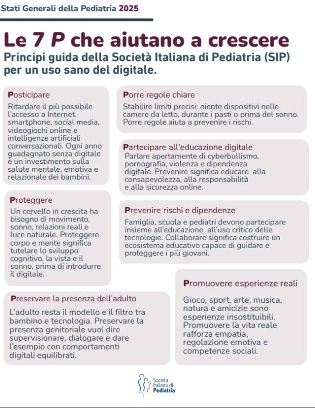 Il prezzo invisibile. I bambini dormono meno, si muovono meno, parlano meno. E, soprattutto, sono più ansiosi e soli. È il prezzo invisibile di una vita digitale che entra troppo presto nelle loro giornate. Le ricerche più recenti lo dimostrano con dati concreti: bastano 30 minuti in più al giorno di esposizione agli schermi per raddoppiare il rischio di ritardo del linguaggio nei piccoli sotto i due anni. Nei bambini tra i 3 e i 5 anni, ogni ora aggiuntiva di schermo riduce il sonno di circa 15 minuti. E già tra i 3 e i 6 anni, oltre 50 minuti quotidiani di dispositivi si associano a un rischio maggiore di ipertensione e sovrappeso. Per questo, alla vigilia della Giornata mondiale del bambino e dell’adolescente (20 novembre), la Società italiana di pediatria (Sip) torna a lanciare un monito forte e chiaro. In occasione degli Stati generali della pediatria 2025, dedicati al tema “Il bambino digitale”, la Commissione sulle dipendenze digitali della società scientifica ha presentato il 19 novembre a Roma, presso il Senato, nuove raccomandazioni e dati aggiornati. Istituzioni, pediatri, psicologi, media e rappresentanti delle piattaforme digitali per riflettere su rischi e opportunità della crescita nell’era del digitale e dell’intelligenza artificiale. “L’esperienza della pandemia da Covid-19 ha aumentato in modo significativo l’esposizione dei minori agli schermi – ha spiegato il presidente Sip Rino Agostiniani – con un tempo medio giornaliero cresciuto di 4–6 ore, raddoppiato rispetto ai livelli pre-pandemici. Questo cambiamento ha reso ancora più necessario un aggiornamento delle precedenti raccomandazioni.