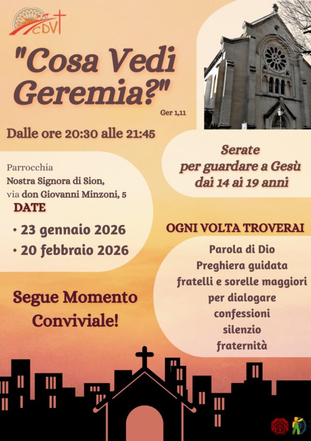 Un invito a fermarsi, guardare e lasciarsi interrogare dalla Parola di Dio. È questo lo spirito delle serate “Cosa vedi, Geremia?”, rivolte ai ragazzi e alle ragazze dai 14 ai 19 anni, in programma presso la parrocchia Nostra Signora di Sion, in via don Giovanni Minzoni 5.