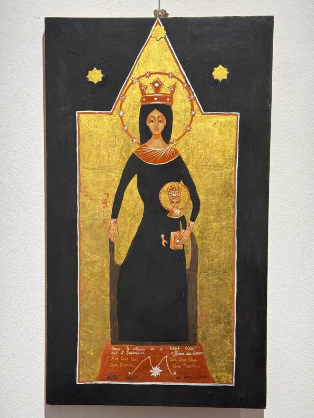 Il titolo NOTRE DAME richiama la Madre di Dio e la Sapienza, ma anche evocano le grandi vetrate e le statue lignee delle Madonne nere francesi. Le tavole sono realizzate secondo una tecnica antica: abete preparato con bisso di lino, alabastro di Volterra, bolo rosso armeno, oro zecchino e tempera a uovo, completate da una vernice finale che ne esalta la vibrazione ottica.