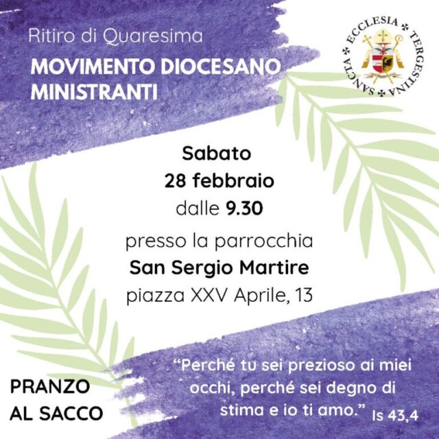 È in programma sabato 28 febbraio il Ritiro di Quaresima del Movimento Diocesano Ministranti, che si svolgerà a partire dalle ore 9.30 presso la parrocchia di San Sergio Martire – piazza XXV Aprile 13.