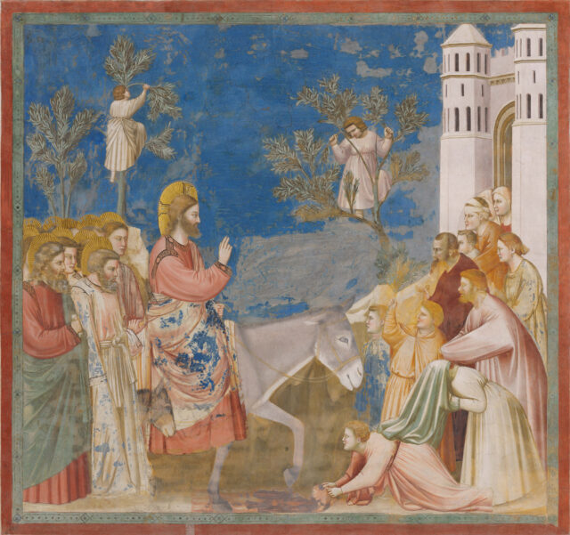 i ragazzi che staccano i rami per sventolarli in segno di festa per Gesù. Al di sotto, le varie persone (specialmente quelle a sinistra) si coprono una con l’altra, chi sta davanti e chi dietro, perché Giotto non sente più il bisogno di scaglionarle sul piano bidimensionale.