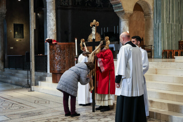 Segue l’Adorazione della Croce: dopo la solenne ostensione, ogni fedele è chiamato a genuflettersi e baciarla.