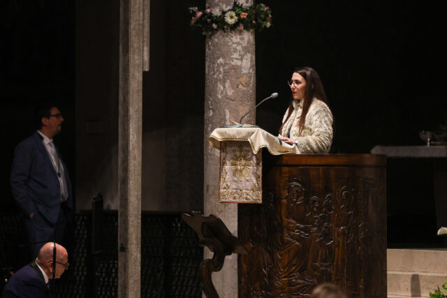 Il diacono proclama il preconio pasquale: l’assemblea incorona il canto stando in piedi con la candela accesa.